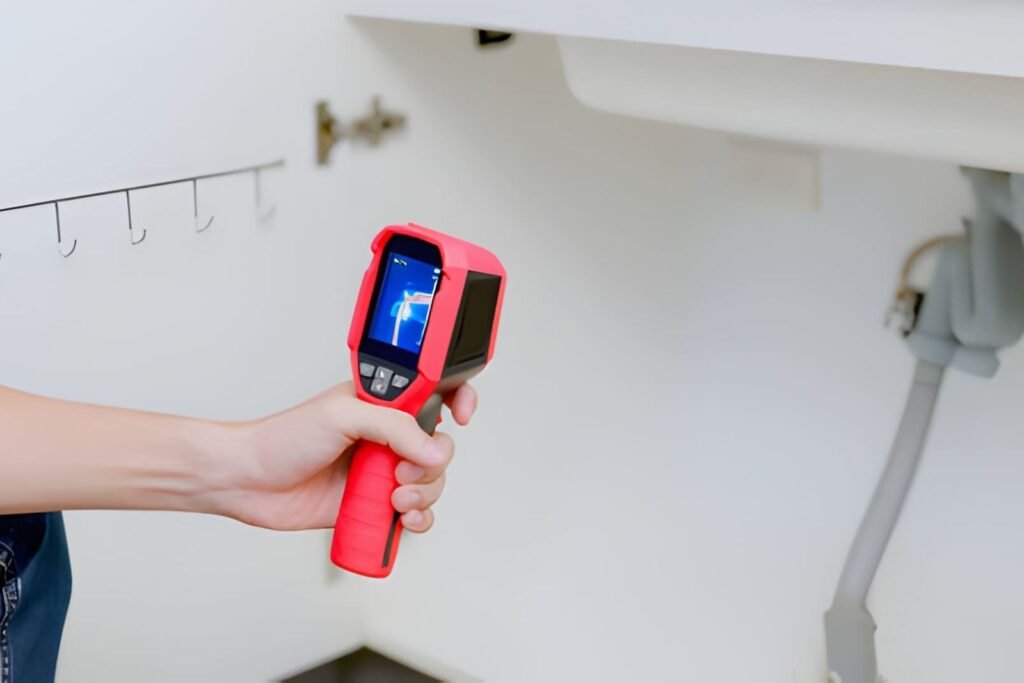 We check the whole building with thermal imaging tools. This helps us see where the water is hiding in walls.